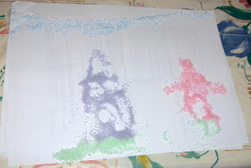 Non so se si capisce, ma ha fatto il prato verde, una casa viola con il tetto a punta, un bimbo rosa e il cielo azzurro. Non era per niente facile e cio' che mi ha colpito e' che nonostante lui sia un tipo maldestro, poco preciso, elefante nei movimenti, e' riuscito a non mischiare i colori, a non trascinarsi con la manica il sale da una parte all'altra del foglio, sono davvero soddisfatta.